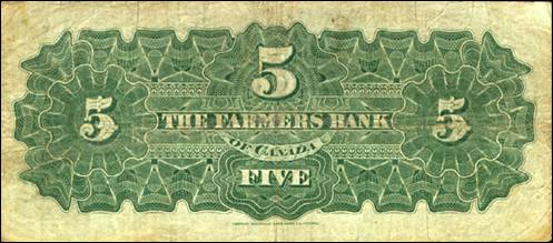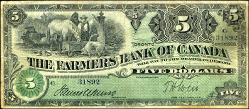 1908 Farmers Bank of Canada $5 Note The Farmers Bank of Canada had a very brief and disgraceful career, failing disastrously in 1910. It was grossly mismanaged, and violated the Bank Act from its beginning. Funds were lost in silver mine speculation which ought to have been used for proper banking activities. Its failure was the subject of a parliamentary investigation. The bank issued a range of notes from $5 through $100 in 1907-08, including an unusual and attractive $25 denomination. All notes issued by the bank are very rare, and only the $5 is available at all (at a hefty price) to the collecting public. Other denominations such as still survive are permanently located in institutional collections. Notes of the bank are still redeemable, having been guaranteed by the Bank Note Redemption Fund established under the 1891 revision of the Bank Act. Contributor: RJG [ Back ] |
